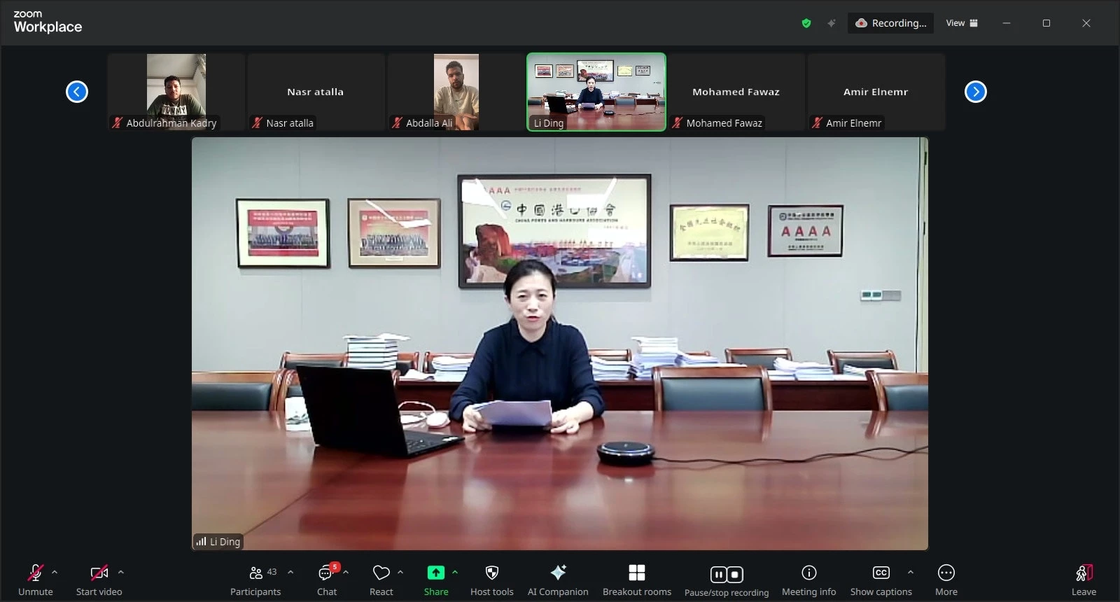 خلال كلمته الافتتاحية، استعرض ا.د. علاء محمود مرسي أبرز أنشطة المعهد وشراكاته الدولية، مشدداً على أهمية التعاون الاستراتيجي مع الصين، كما كشف عن أجندة المعهد الدولية لعام 2025. من جهته، أعرب القنصل الصيني عن اعتزازه بالعلاقات المتينة بين مصر والصين، وأشاد بالدور البارز للأكاديمية العربية في تعزيز التبادل العلمي والمعرفي. ???? كما قدمت السيدة دينج لي– السكرتير العام لاتحاد الموانئ والمرافئ الصينية – شكرها لمعهد تدريب الموانئ، مشيدة بالتعاون الفعّال الذي أثمر عن هذا البرنامج المتميز. يُقام البرنامج خلال الفترة من 10 إلى 14 أغسطس عبر البث المباشر، ويشهد مشاركة نخبة من المتدربين من الدول التالية: