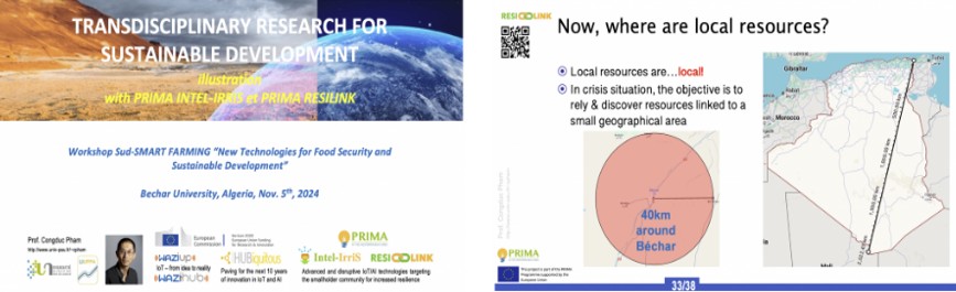 On November 5th, 2024, Prof. Congduc Pham, coordinator of the RESILINK project from UPPA, delivered a keynote at the Smart Farming Workshop held during the IEEE EDiS 2024 International Conference on Embedded and Distributed Systems in Béchar, Algeria. His talk, titled “Transdisciplinary Research for Sustainable Development: Illustration with PRIMA INTEL-IRRIS and PRIMA RESILINK,” showcased how RESILINK integrates digital innovation, water-efficient technologies, and sustainable farming practices to address smallholder farmers’ needs. The presentation emphasized the project’s contribution to SDG 6 through optimized irrigation, resource-efficient systems, and sustainable agri-food solutions.