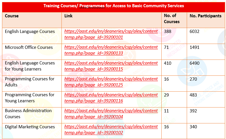 The Arab Academy has provided a variety of training courses and programs to improve access to basic services to eradicate poverty in all its forms everywhere in the Academic year 2023/ 2024. Those training courses and programmes aim to provide direct access to services for the community.