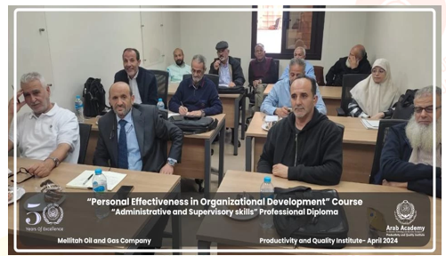 Continuing the series of training programs provided by the Productivity and Quality Institute proposed under the diploma program “Administrative and Supervisory Skills, Professional Diploma," in conjunction with Mellitah Oil and Gas Company, a training course was held titled “Personal Effectiveness in Organizational Development” by Dr. Moustafa El Mokadem on 24th April 2024. This diploma provides individuals with the knowledge and experience necessary to effectively manage administrative tasks and supervise teams within different organizations. By focusing on personal effectiveness within the context of organizational development, this diploma also equips individuals with the skills and mindset needed to thrive in dynamic and rapidly evolving workplaces.