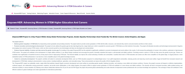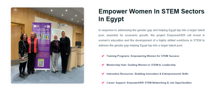 The project’s key objectives are to stimulate innovation and technological advancement in Egypt by encouraging women to pursue STEM careers, which can drive economic growth. Investing in women can lead to developing and commercializing new technologies and ideas. The project aims to develop a highly skilled workforce, attract foreign investment, and encourage the growth of the Egyptian domestic industry, which requires a well-educated and experienced workforce. The objectives also include creating a more inclusive and supportive environment for women in STEM.