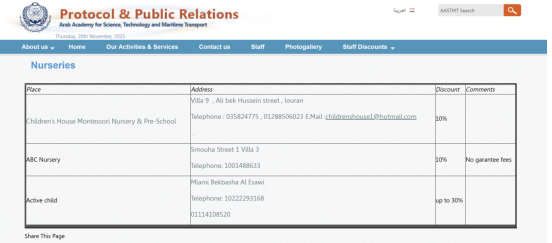 AASTMT recognizes that dependable childcare is essential for staff and works to provide practical, affordable options. In Alexandria and Cairo, the Protocol & Public Relations unit maintains published arrangements with local nurseries that offer staff discounts—see the “Nurseries” page for providers and rates.