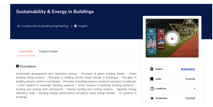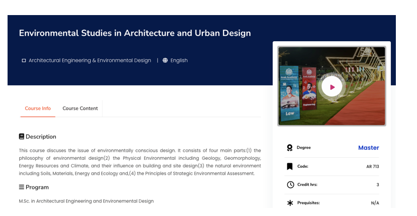 This postgraduate course, offered within the M.Sc. in Architectural Engineering and Environmental Design, examines environmentally conscious architecture and the relationship between natural and built environments. Students explore ecological design principles, environmental assessment methods, and sustainability-focused planning approaches. By emphasizing resource efficiency, environmental performance, and responsible urban development, the course provides a dedicated academic pathway that strengthens learners’ abilities to integrate sustainability considerations into architectural and urban design decisions. In doing so, it contributes to expanding the range of sustainability-oriented courses within the university’s formal curriculum.