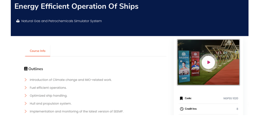 In line with AASTMT’s emphasis on embedding sustainability principles within its educational pathways, this course enhances learners’ capacity to apply environmentally conscious practices in maritime operations. Energy Efficient Operation of Ships (NGPSS 1020) provides a structured understanding of the environmental implications of ship performance, highlighting fuel-efficient strategies, emissions reduction, and alignment with international climate-related standards. Through its focus on greenhouse gas impacts, SEEMP implementation, and key energy-performance indicators such as EEDI, EEXI, and CII, the course offers a comprehensive learning experience that prepares students to address contemporary sustainability challenges in the maritime sector.