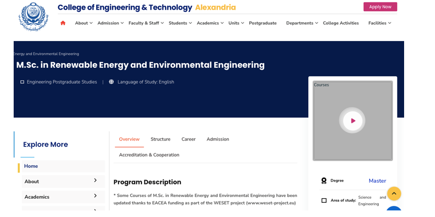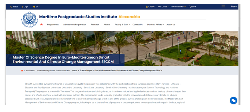 SECCM (Accredited by Supreme Council of Universities-Egypt) The program was established with the participation of four European countries (Italy - Greece - Lithuania - Slovenia) and four Egyptian universities (Alexandria University - Suez Canal University - South Valley University - Arab Academy for Science, Technology and Maritime Transport) The program is provided in Two Years This program is unique and distinguished, as it combines natural and applied sciences curricula to study climate changes, their causes and effects, and how to deal with and adapt to them. The program also works to qualify graduates with the knowledge and skills necessary to take on job jobs associated with local, regional, and international efforts to deal with climate change, which is one of the greatest current challenges of modern societies. The Master of Smart Management of Environment and Climate Change program is looking to be at the forefront of programs in preparing students to manage climate changes in the local, regional, and international environmental, research, and industrial sectors. The graduate will meet the needs of the growing labor market in Egypt, the Arab countries, and Europe since there are joint European universities in teaching the program, and this specialization is a unique study in the Middle East region in general.