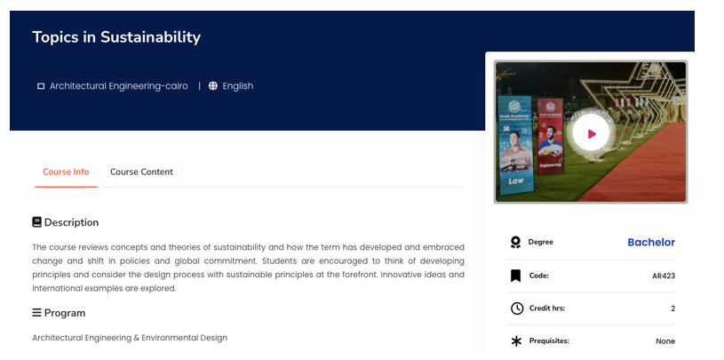 AASTMT maintains a strong commitment to embedding sustainability within its academic pathways by providing a selection of dedicated courses and learning options that directly engage with SDG-related themes. These offerings give students structured opportunities to explore sustainability concepts, understand global challenges, and develop practical competencies connected to environmental and socio-economic issues. Alongside classroom learning, the university encourages participation in sustainability-oriented projects and experiential activities, ensuring that students gain a well-rounded perspective on sustainable development. This integrated approach reflects AASTMT’s ongoing effort to prepare graduates who can actively contribute to advancing the SDGs in their professional and community roles.