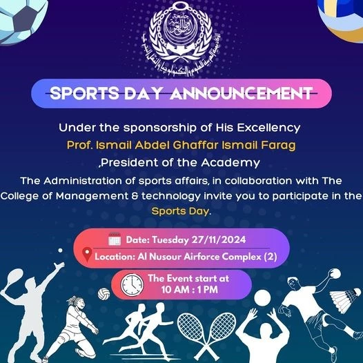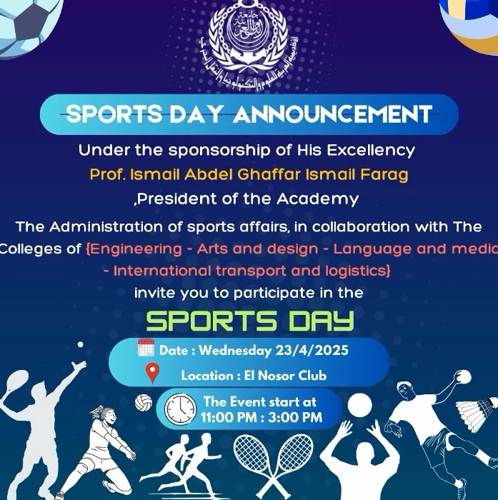 تُعلن إدارة الشؤون الرياضية بمقر الأكاديمية بمصر الجديدة بالتعاون مع إدارات كُليات ( الهندسة - الفنون و التصميم - اللغة و الإعلام - النقل الدولى و اللوجستيات)عن إقامة فعاليات اليوم الرياضى الخاص بالكُليات يوم الإربعاء (23/4/2025) بمقر نادى النسور بشيراتون.