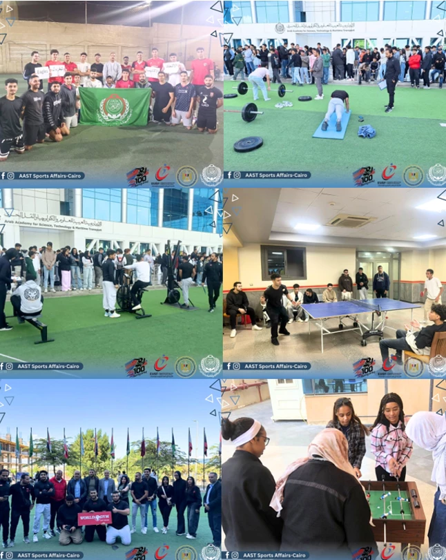 تحت رعاية فخامة رئيس الجمهورية/ عبدالفتاح السيسى و معالى الأستاذ الدكتور/ محمد أيمن عاشور وزير التعليم العالى والبحث العلمى و رئيس الاتحاد الرياضى المصرى للجامعات و سعادة الأستاذ الدكتور/ إسماعيل عبدالغفار رئيس الأكاديمية العربية للعلوم والتكنولوجيا و النقل البحرى قامت إدارة الشئون الرياضية برئاسة الدكتور/ شادى عبدالعزيز - مدير إدارة الشئون الرياضية بفروع الأكاديمية بالقاهرة أقيمت فعاليات اليوم الرياضى الخاص بفروع الأكاديمية بمصر الجديدة و القرية الذكية و الدُقى و بورسعيد بمقر نادى النسور بشيراتون, تدشينا لفعاليات مبادرة 100 يوم رياضة ضمن فعاليات مبادرة بداية لبناء الأنسان التى أطلقها السيد رئيس الجمهورية و ذلك بحضور طلاب فروع الأكاديمية بمصر الجديدة و القرية الذكية و الدُقى و بورسعيد.