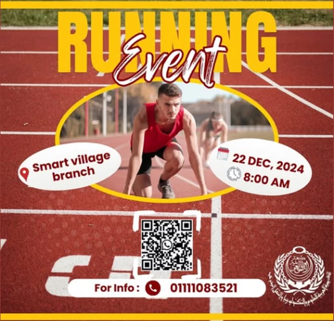 تعلن إدارة الشئون الرياضية بالأكاديمية العربية للعلوم والتكنولوجيا والنقل البحرى فرع القاهرة عن إقامة مارثون للجرى بفرع القرية الذكية. الأحد ٢٢ديسمبير ٢٠٢٤.امام مبنى الإدارة. ٨:٠٠ صباحاً.فرع القرية الذكية.