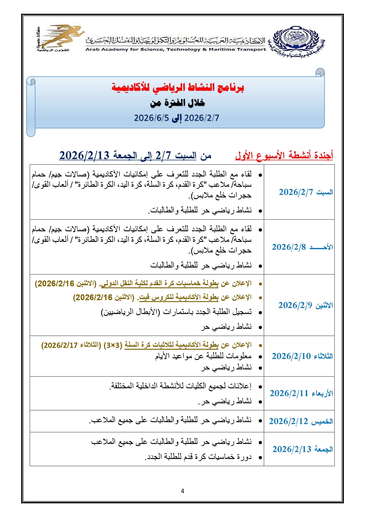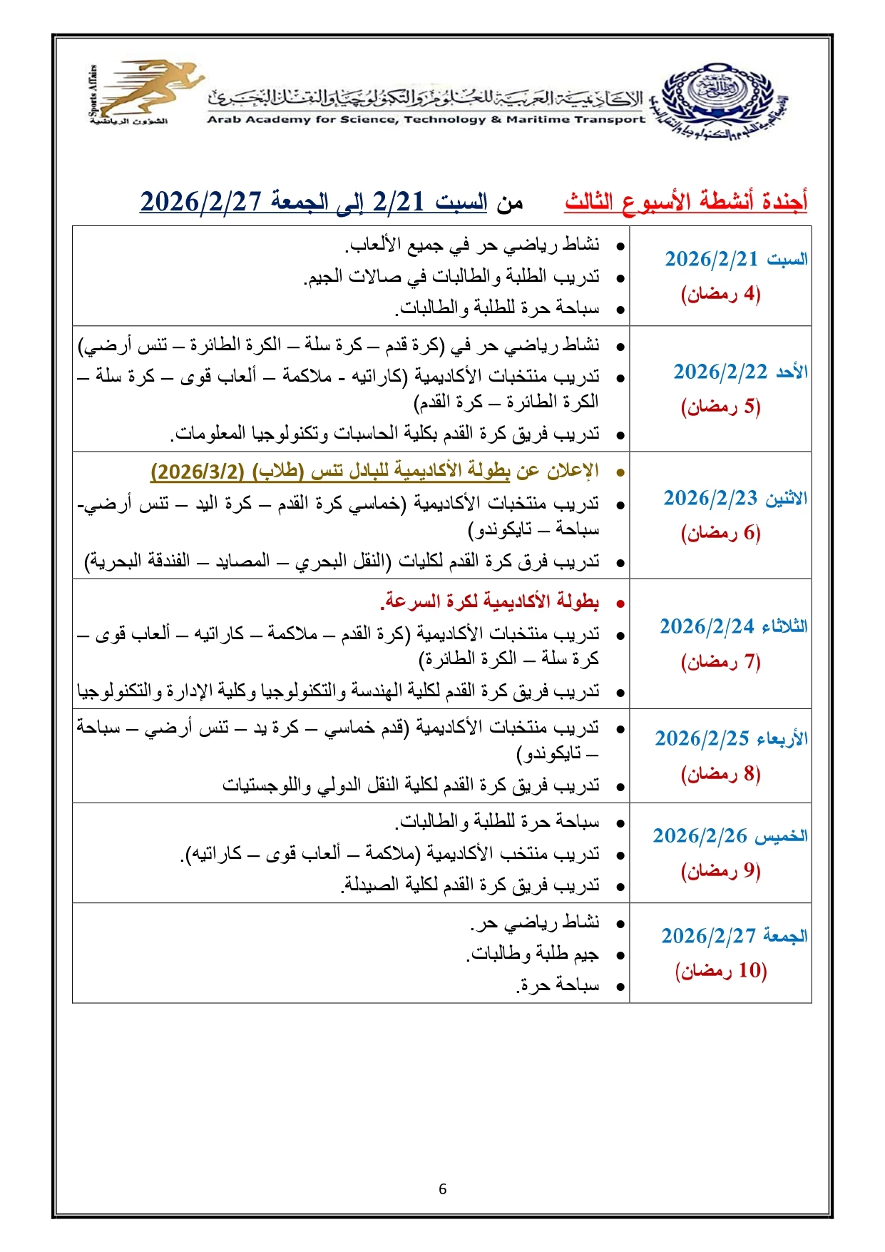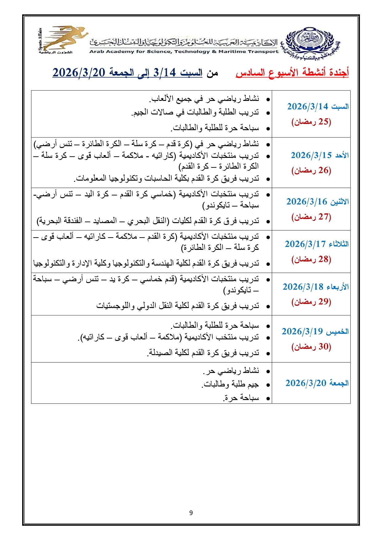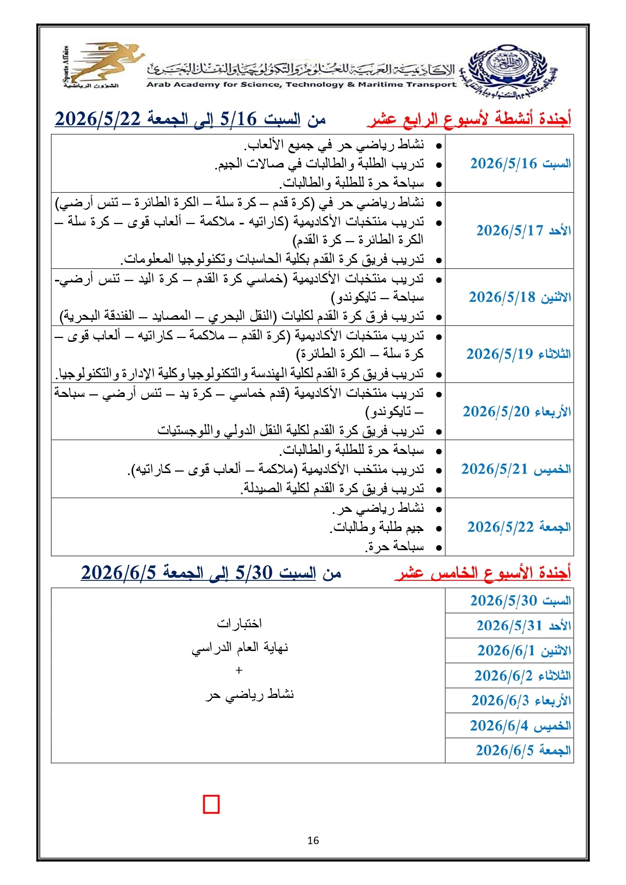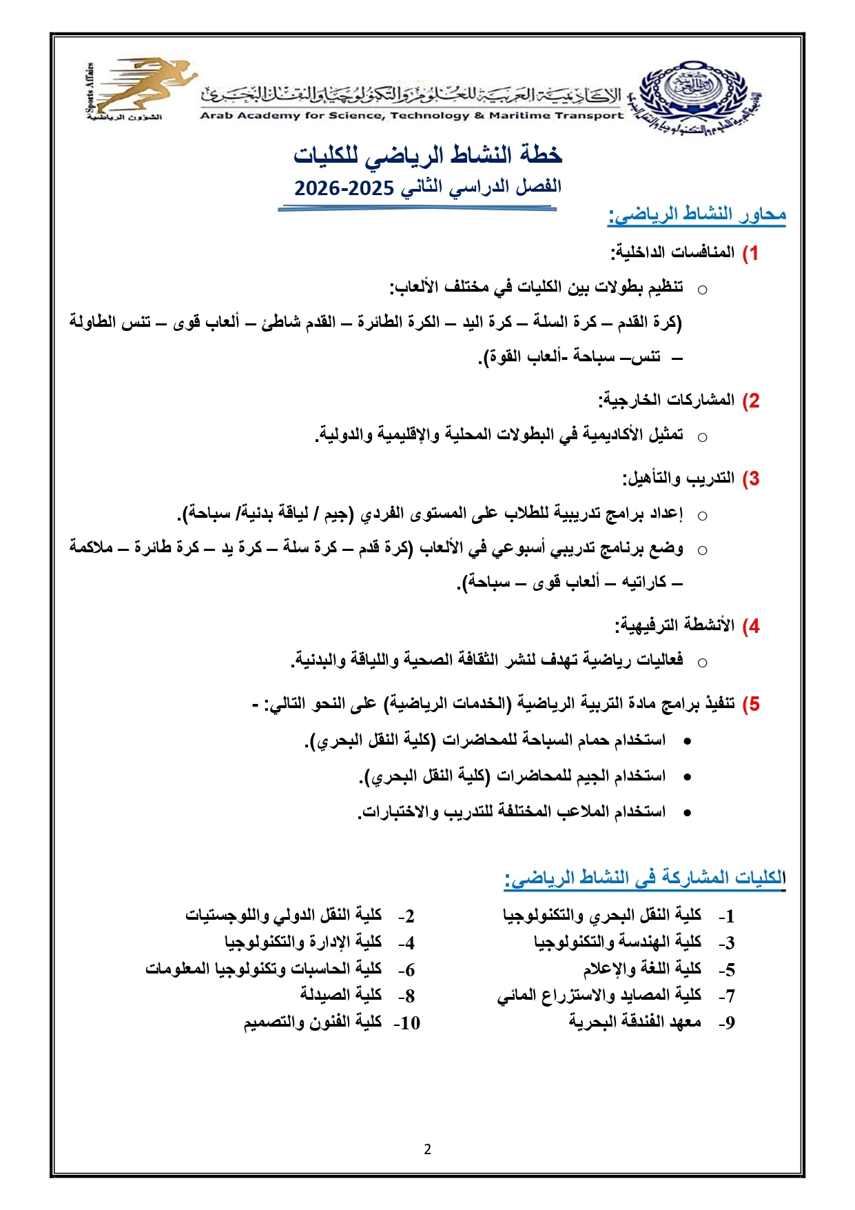 خطة النشاط الرياضي 2026/2025