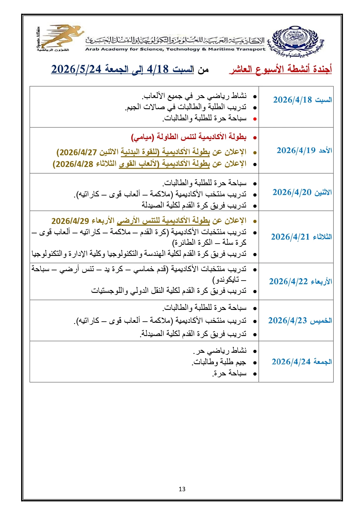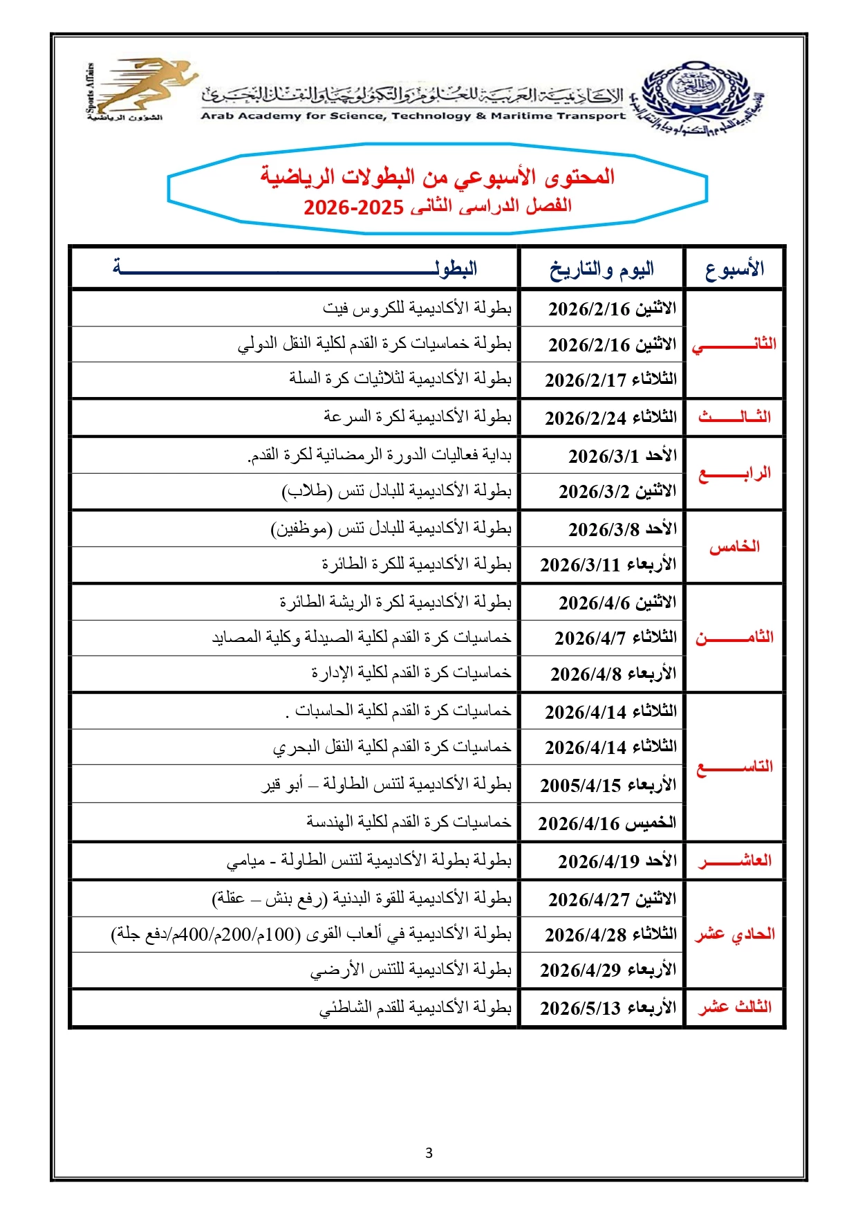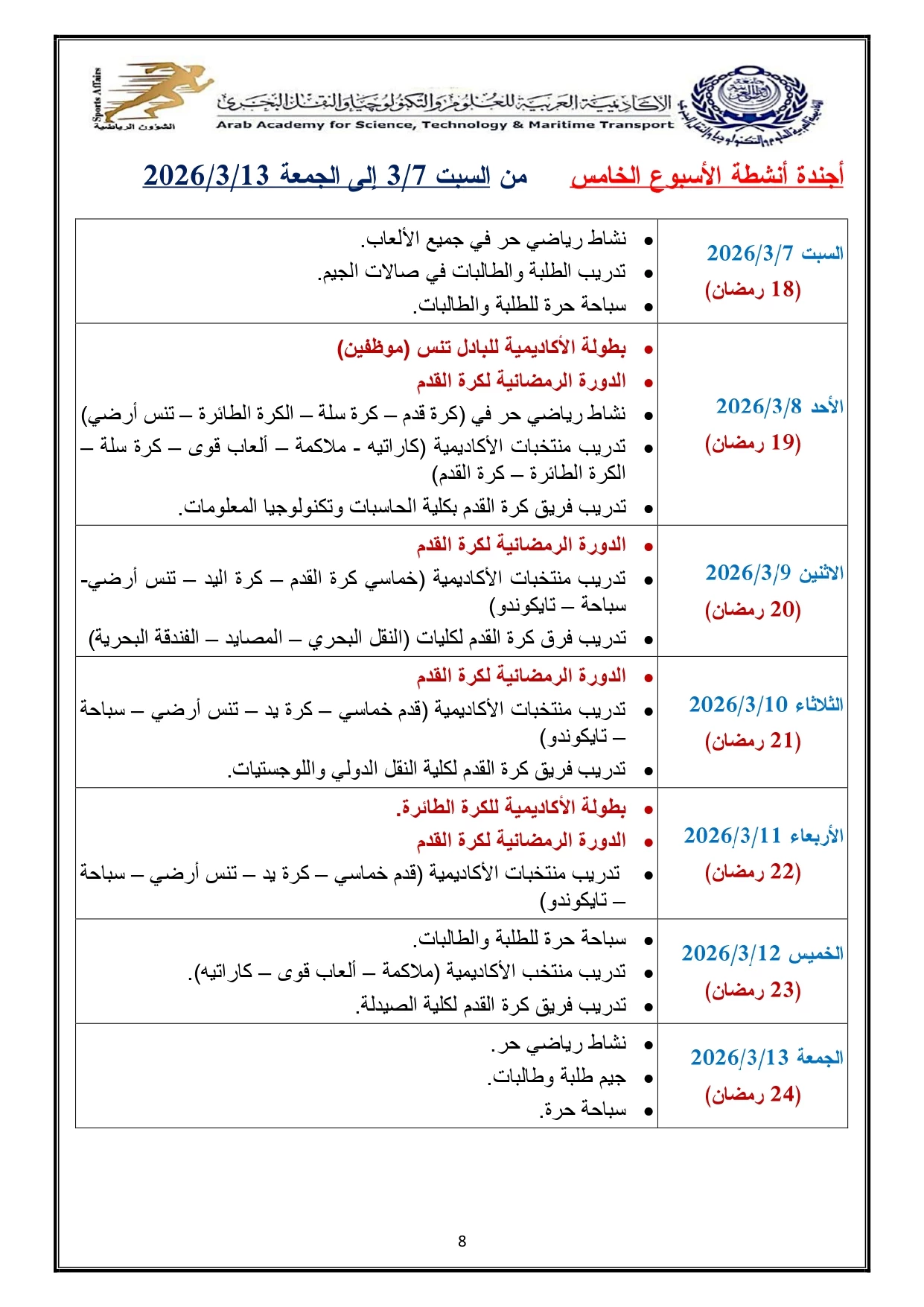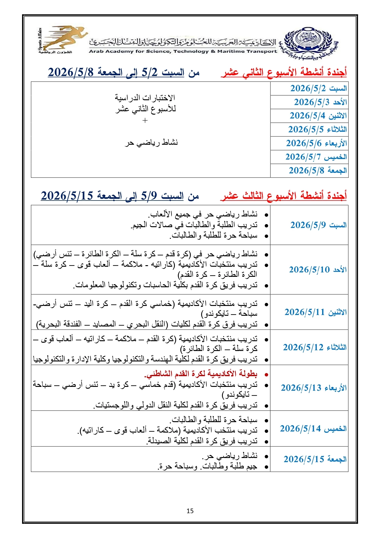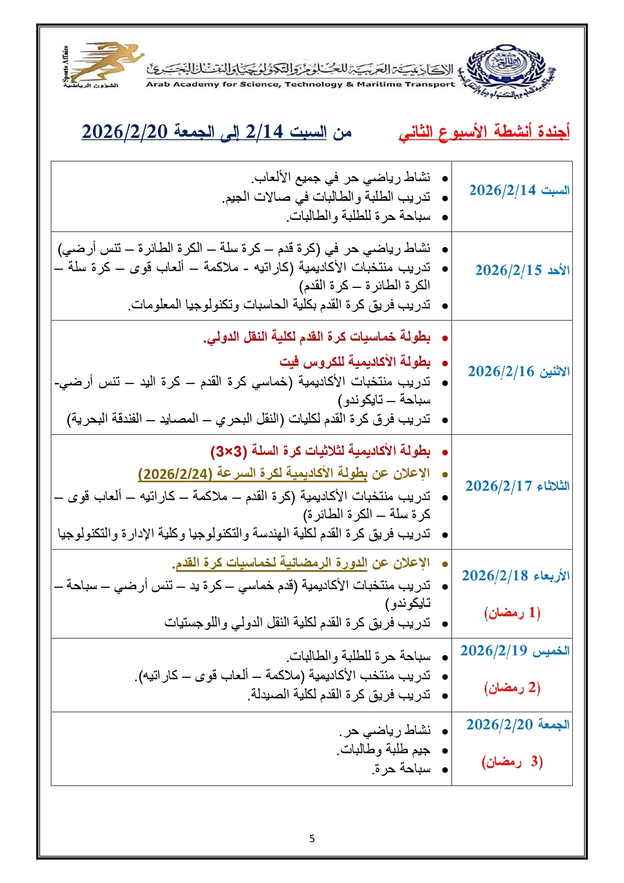 خطة النشاط الرياضي 2026/2025