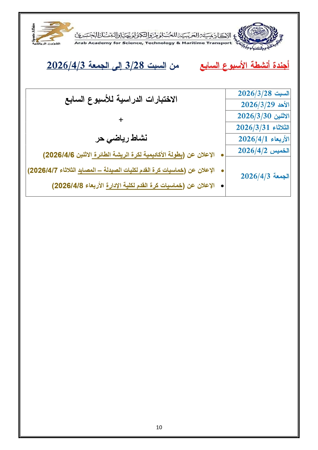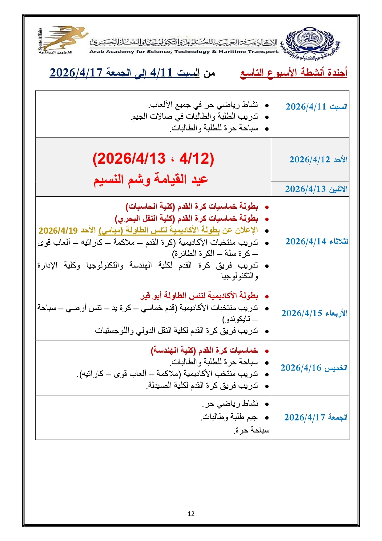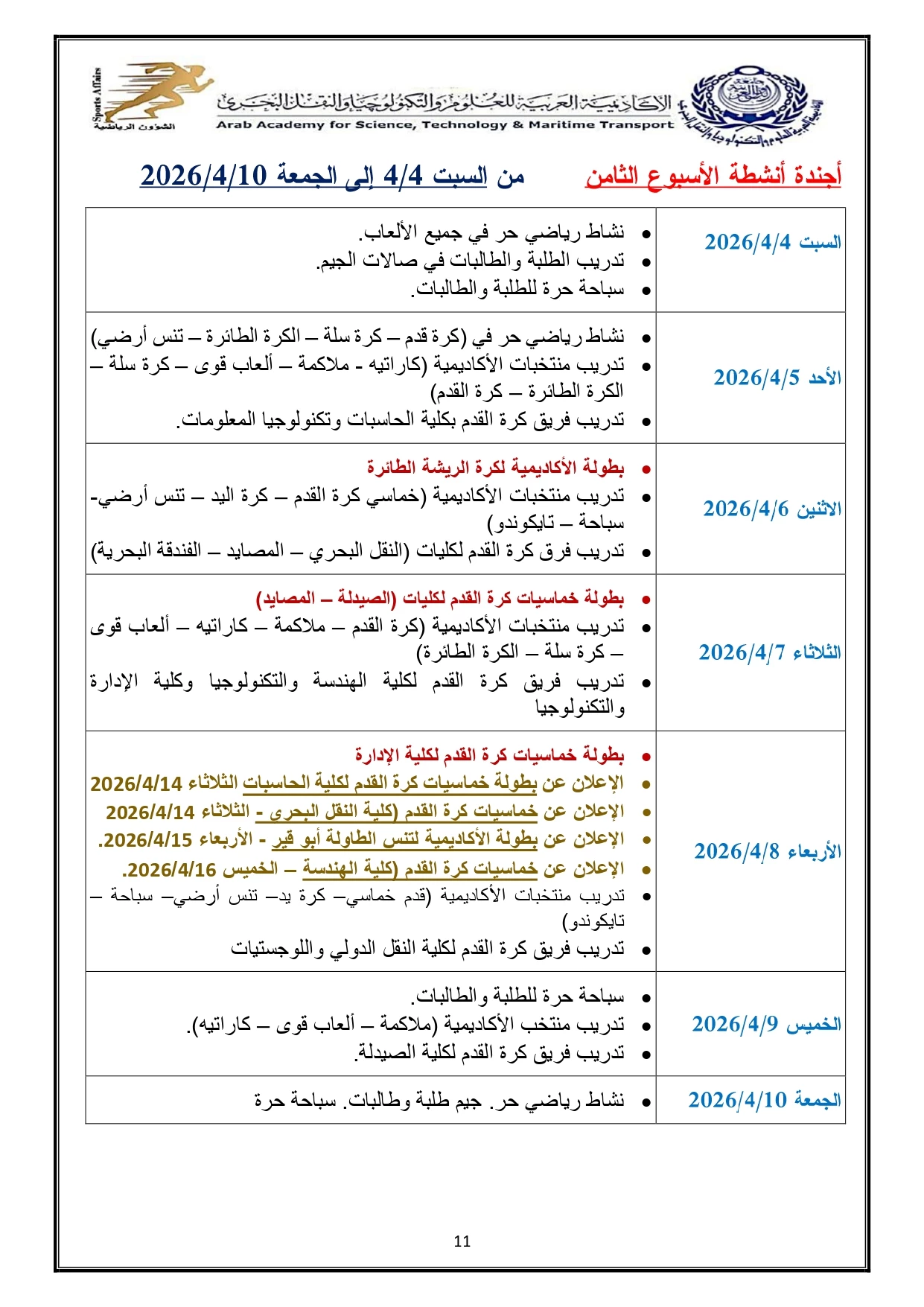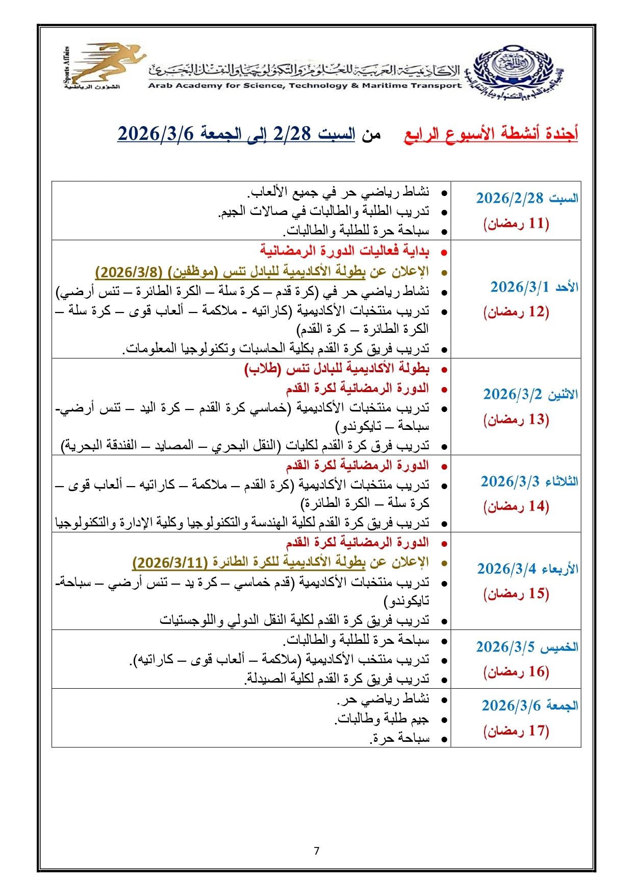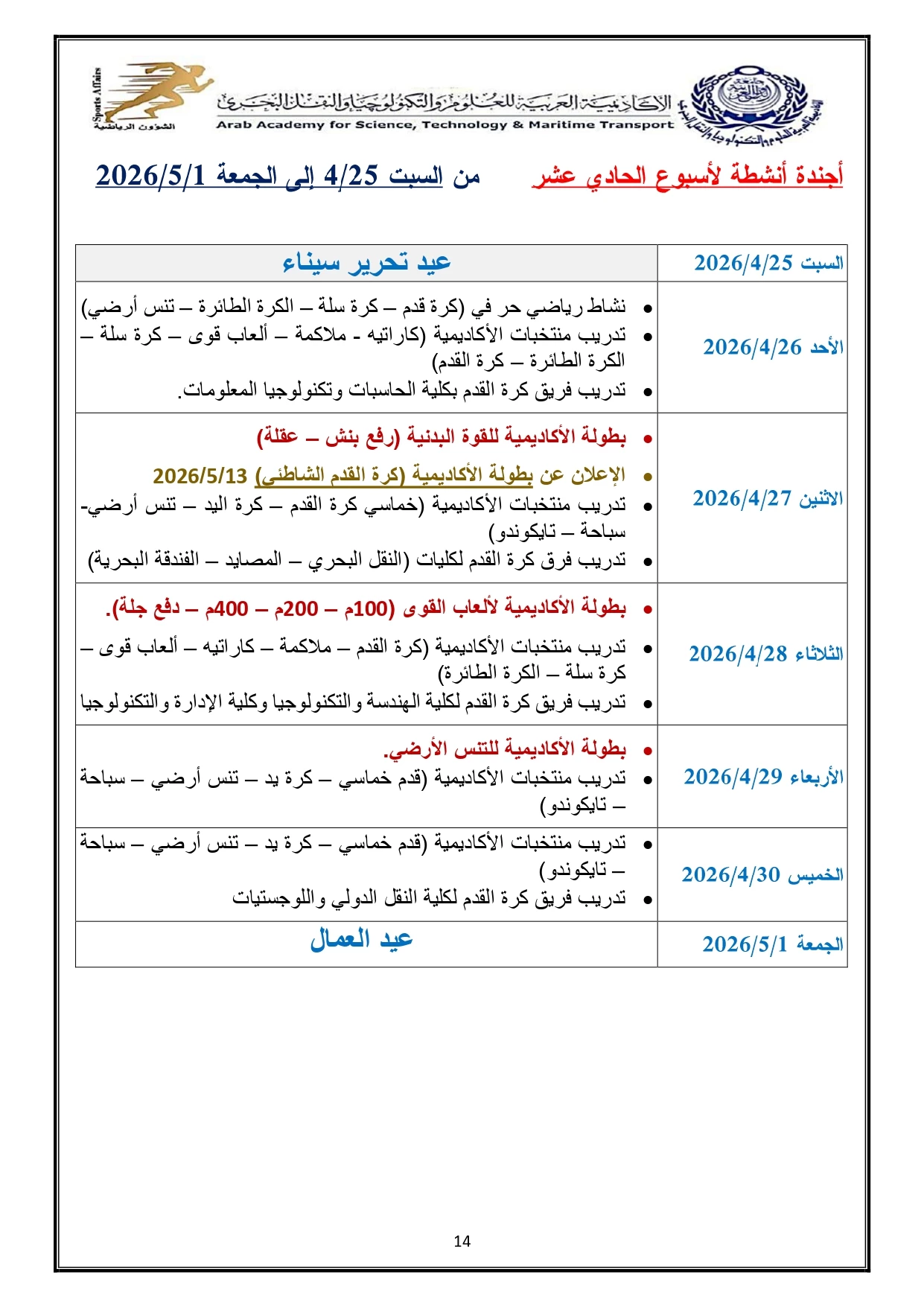 خطة النشاط الرياضي 2026/2025