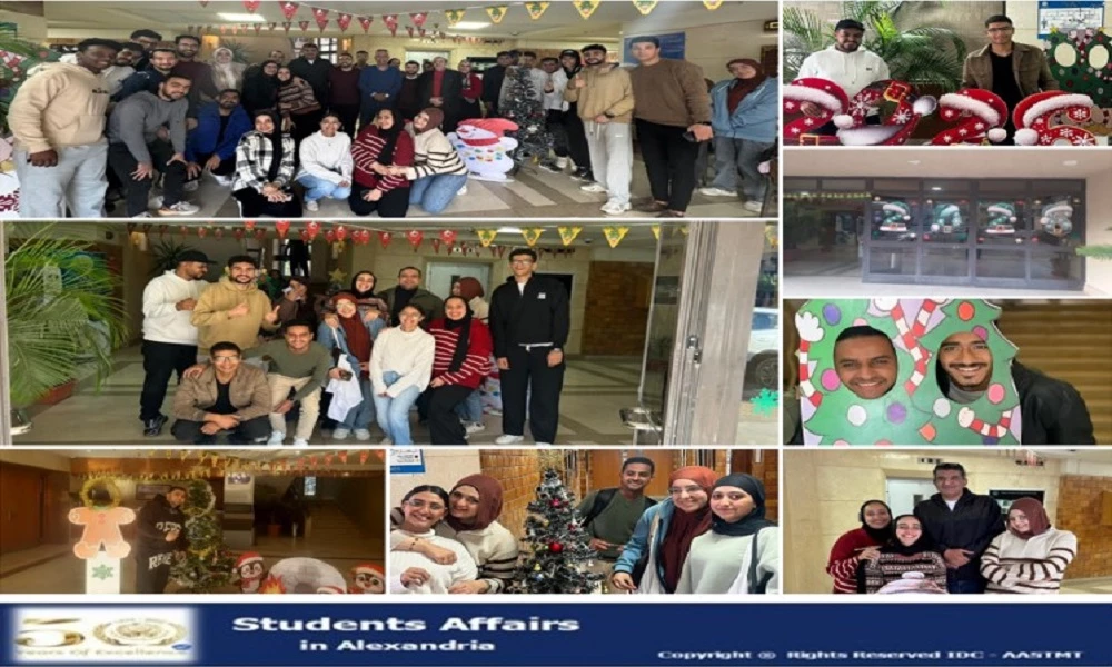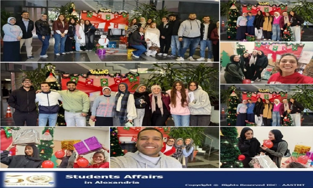 The Cultural and Social Activities Department at Abu Qir University organized a special celebration to welcome the new year 2026. Students from the College of International Transport and Logistics participated in the event, which aimed to support meaningful student activities and foster a sense of belonging and university life within the academy. The celebration took place in a joyful and optimistic atmosphere, with students decorating the college corridors and main staircase with winter and New Year's decorations. This display reflected the spirit of cooperation, creativity, and teamwork among the students, with the participation and support of the supervisors of cultural and social activities at the Deanship of Student Affairs. The event emphasized the importance of cultural and social activities in developing students' personalities and promoting positive values such as cooperation, belonging, and human interaction, thus contributing to a supportive and stimulating university environment that fosters creativity and innovation. The celebration concluded with students exchanging greetings and wishing each other a new year filled with success, academic achievements, and outstanding activities. The Deanship of Student Affairs is committed to supporting student initiatives that contribute to achieving the Sustainable Development Goals, particularly those related to enhancing the quality of life within the university community.