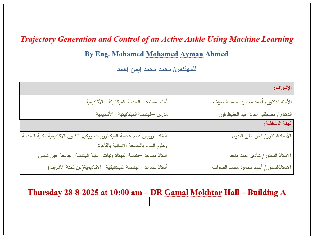 The deparment announces the Masters Thesis defense for Eng. Ahmed Mansour Ahmed Hassan entitled: