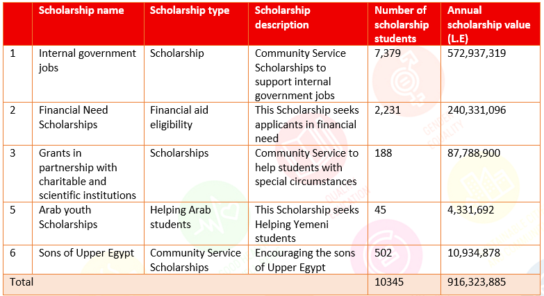 The scholarships include internal government jobs, financial need scholarships, grants in partnership with charitable and scientific institutions, Athletic scholarships, Arab youth scholarships and scholarships of upper Egypt. Following are the number of scholarships students and the scholarship value in each: