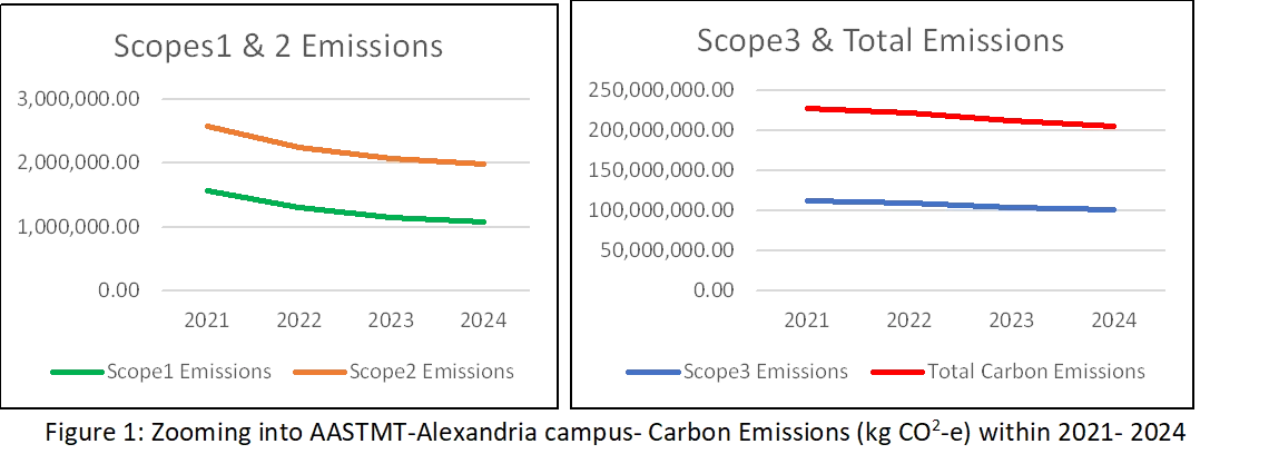 Calculations were made to evaluate carbon emissions (kg CO2-e) in Alexandria campus for the years 2018 to 2023 as shown in Table 1. Table 1 presents the emissions across Scope1, Scope2, and Scope3, using the Greenhouse Gas Protocol's framework. These figures provide insights into direct and indirect emissions, as analysed in AASTMT 2022/2023 Emissions Progress Report, helping to identify key areas for improvement.