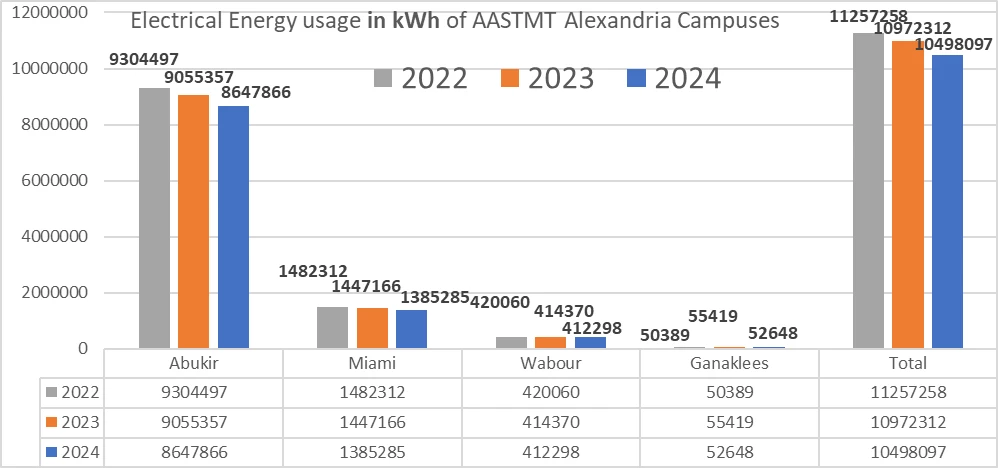 These renewal, upgrading, and control efforts in different campuses of AASTMT Alexandria branch have resulted in total electricity savings in 2024 of 474,289 kWh from 2023 as shown in Table 1 and given by 2024 Energy Conservation Report. This verifies the effectiveness of AASTMT plan and measures towards energy efficiency and saving in its entire Alexandria campuses in 2024.