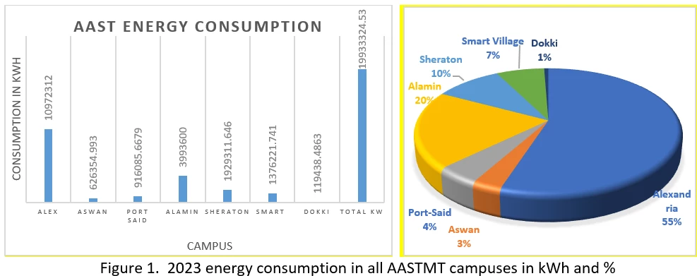 For, 2022 energy consumption insights in different AASTMT campuses, AASTMT 2022/2023 Insights, it was found that Alexandria campus experience highest energy consumption, as shown in Figure 1, and in turn highest energy wastage. This is related to the fact that Alexandria campus features multiple branches, oldest infrastructure and largest number of staff and students, compared to other AAST campuses. Hence, in AASTMT 2022/2023 procedures, towards wastage identification, energy saving and buildings’ renovation to higher energy efficiency, are applied primarily to Alexandria campus as discussed in details in AASTMT 2022/2023 Plan towards Clean Sustainable Energy. The effect of these procedures on energy consumption and wastage reduction in 2022/2023 is detailed in AASTMT 2022/2023 Energy Progress Report