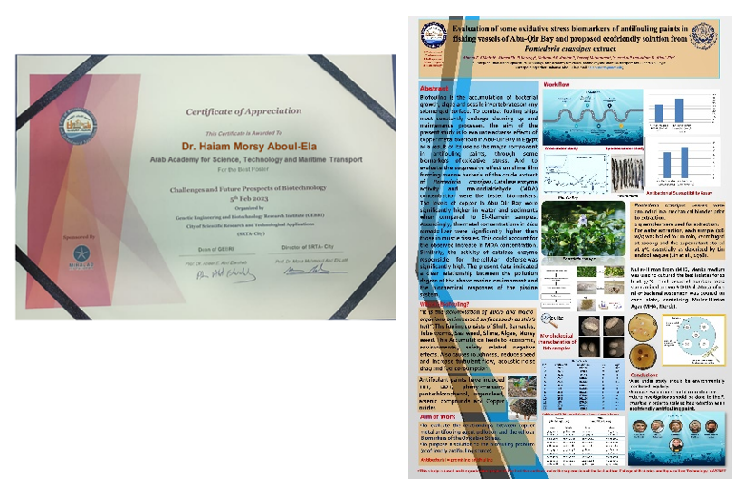 Students at the College of Fisheries and Aquaculture Technology participated in 2023 in the First International Conference of the Institute of Genetic Engineering Research "Challenges and New Prospects in Biotechnology Sciences" at the City of Scientific Research and Technological Applications. It was recognized as the best poster presented at the conference.