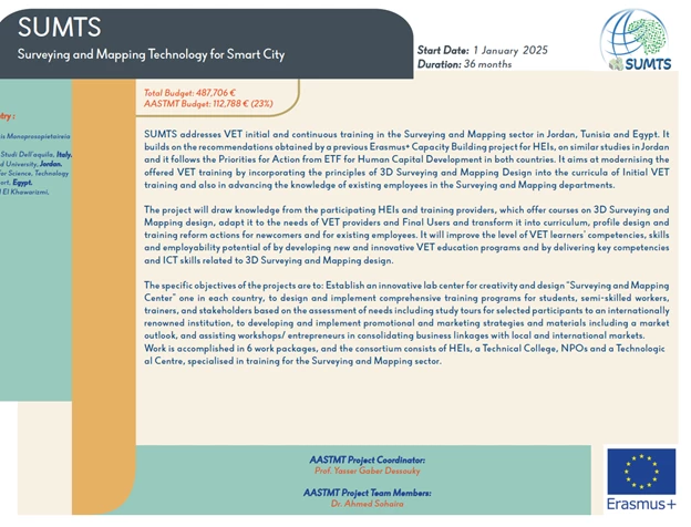The SUMTS project aims to modernize education and training in Surveying and Mapping Technology across Egypt (AASTMT), Jordan, and Tunisia. It focuses on incorporating 3D surveying, mapping, and geospatial design into Vocational Education and Training (VET) programs.
