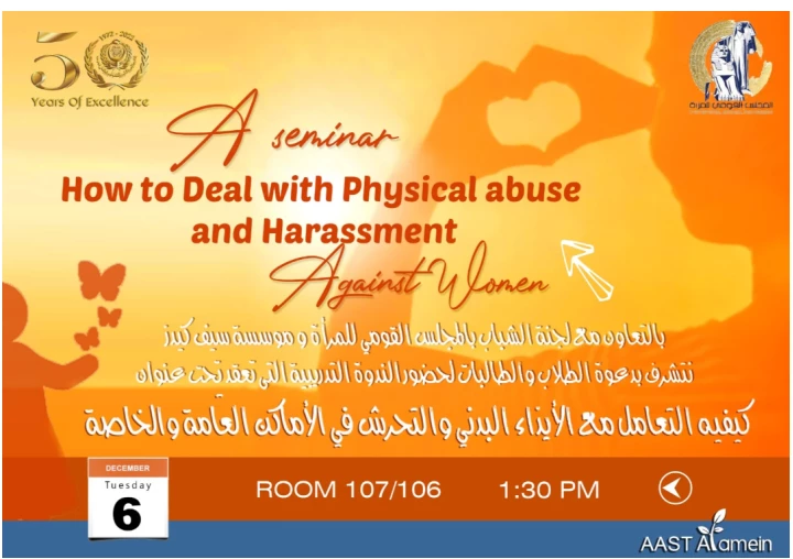 In line with its Anti-Harassment and Equal-Opportunity policies, AASTMT collaborates with national partners to raise awareness and prevent discrimination and abuse.