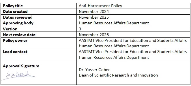 The Arab Academy for Science, Technology, and Maritime Transport has implemented this policy to guarantee that all students and employees experience an environment free from unlawful harassment and retaliation. The Academy will make every reasonable effort to ensure that all individuals are informed of these policies and understand that any complaints regarding violations will be thoroughly investigated and addressed appropriately.