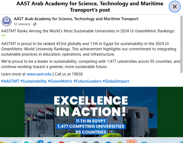 AASTMT was ranked 453rd globally and 11th in Egypt in the 2024 UI GreenMetric rankings, which evaluates universities on environmental sustainability metrics (campus, energy, waste, etc.). This ranking demonstrates external validation of institutional commitment to environmental metrics.