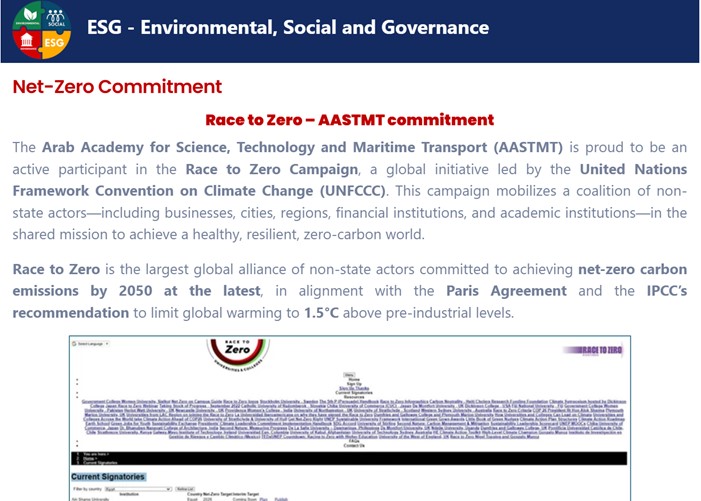 AASTMT’s participation in the global Race to Zero campaign underscores its commitment to becoming a carbon-neutral university. By aligning with Greenhouse Gas Protocols, AASTMT aims to achieve net-zero emissions, reinforcing its dedication to reducing CO2 emissions and supporting climate resilience through sustainable practices and operations.