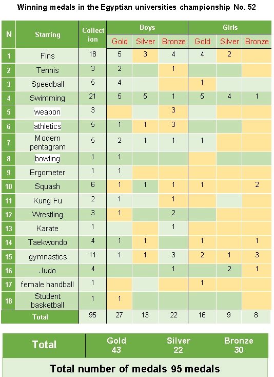 The stars of the Egyptian national team and the academy's speedball team obtained an overall ranking (first universities) with the participation of 26 universities during the university speedball championship competitions, and the medals were as follows: