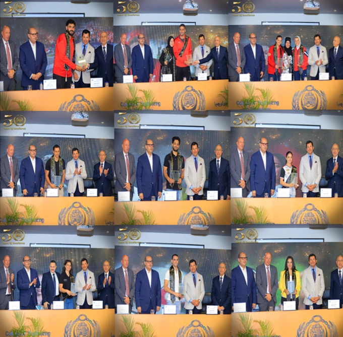 15. - World champion in modern pentathlon/Muhannad Tariq Shaaban – enrolled in the Faculty of Engineering and Technology, Heliopolis Branch, and due to his connection to the Paris Olympics preparation camp, his mother, Mrs. Nermin Sobhi, kindly received the shield of honor.