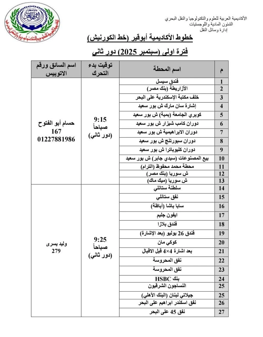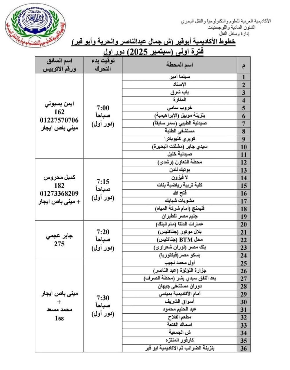 The Arab Academy for Science, Technology and Maritime Transport includes a fleet of modern buses that are fully air-conditioned and prepared for long trips. The Arab Academy’s Transportation Department provides a distinguished transportation service at the branch level to transport our students and workers with a fleet of German-made Mercedes buses equipped with the latest technical means. All buses have free Wi-Fi service, and all vehicles have GPS devices that add more security to the service to determine the locations and movements of all vehicles to ensure the safety of passengers during daily trips. The transportation service covers all major areas within Alexandria Governorate and also from Alexandria to El Alamein, with a transportation capacity of up to 1,400 students/day. Buses transport students, faculty members and workers to and from the academy’s headquarters in Miami and Abu Qir according to a timetable. Some lines also cover the city of Alexandria from Abu Qir to Al-Ajami and Al-Alamein in western Alexandria. All students can subscribe according to the price category specified by the relevant departments. There is also a page on the social networking site to respond to inquiries and review comments from users.