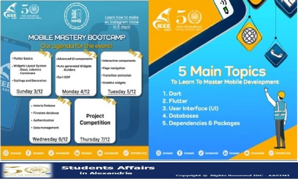 IEEE AAST Alexandria is organizing a "Mobile Mastery Bootcamp" event to train academy students in smartphone application development on 2/12/2023
