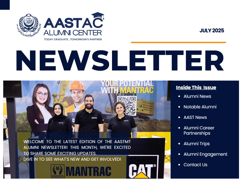 The AASTMT Alumni Center is releasing its July 2025 newsletter .This newsletter helps keep all AASTMT graduates updated on what's new at the AASTMT and among fellow alumni. It's a great way to stay connected and informed about exciting developments and achievements within the community.