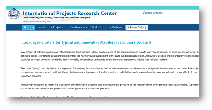 The Arab Academy for Science Technology and Maritime Transport (AASTMT) contribute in many of the international Research projects from here comes the role of the International Research Projects center to coordinate between the Academy and the funding entities on several levels. This project fosters local agricultural value chains, supports producers in their development, and creates new markets for Mediterranean dairy products. It promotes sustainable land use practices indirectly by improving local agricultural productivity, supporting small-scale producers, and integrating agricultural policies. Includes elements of education, outreach, and policy support for sustainable agriculture.