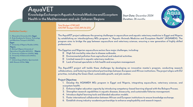 Co-led by AASTMT and international partners, establishes a pioneering MSc in Aquatic Animals Medicine and Ecosystem Health (AQAMEH) to address environmental challenges in aquaculture. The program promotes sustainable agricultural practices, ecosystem restoration, and biodiversity conservation through education, research, and capacity building. Addresses sustainability in aquatic food systems, ecosystem health, and pollution reduction from agriculture and industry.